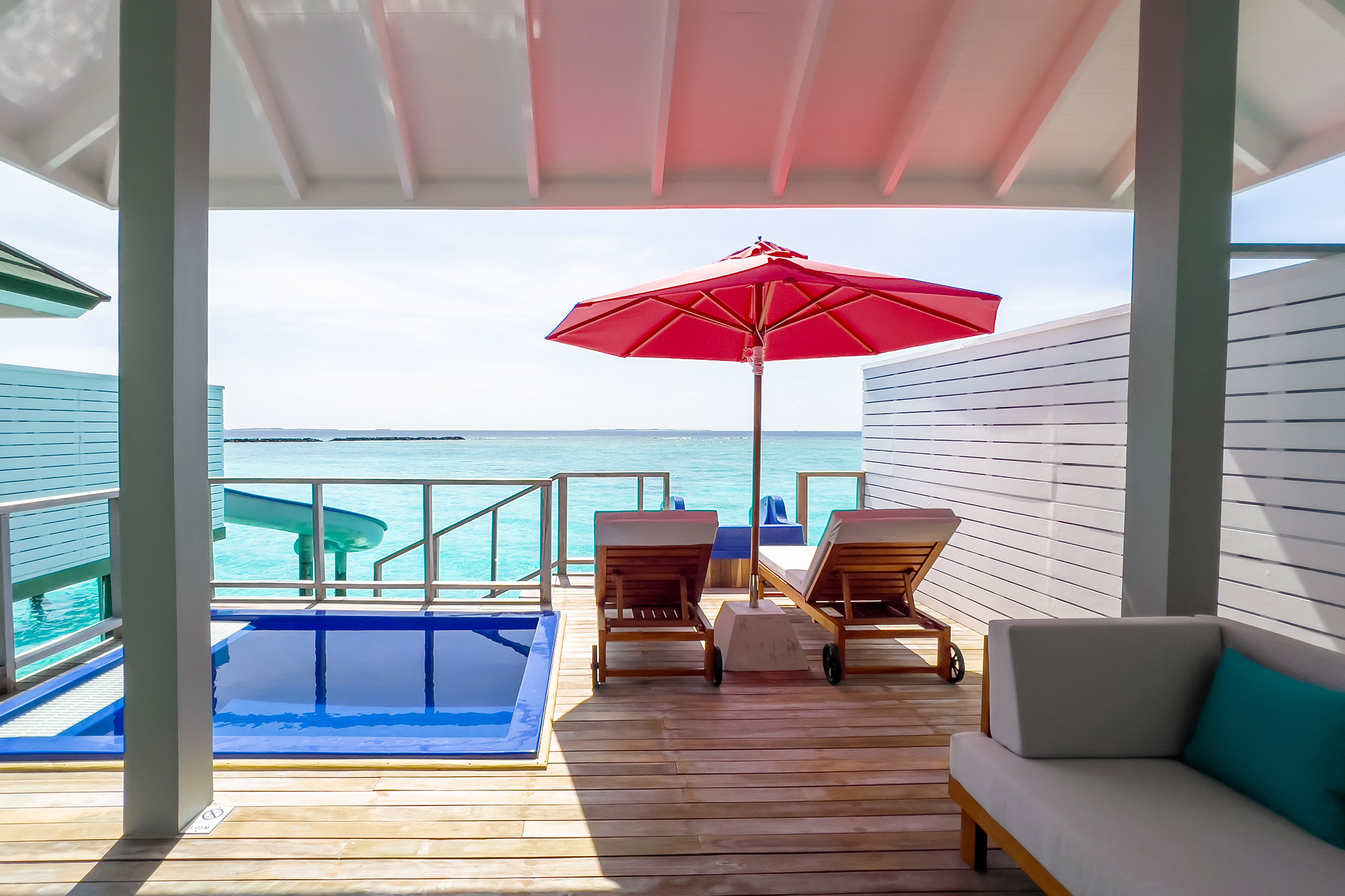 These playful Water Villas offer a private pool with an exhilarating slide, making your stay unforgettable. Enjoy your own sundeck with loungers, a bathroom with an indoor shower, mini bar, and Wi-Fi. With stunning views and the lagoon just steps away, it's the perfect blend of fun and relaxation.