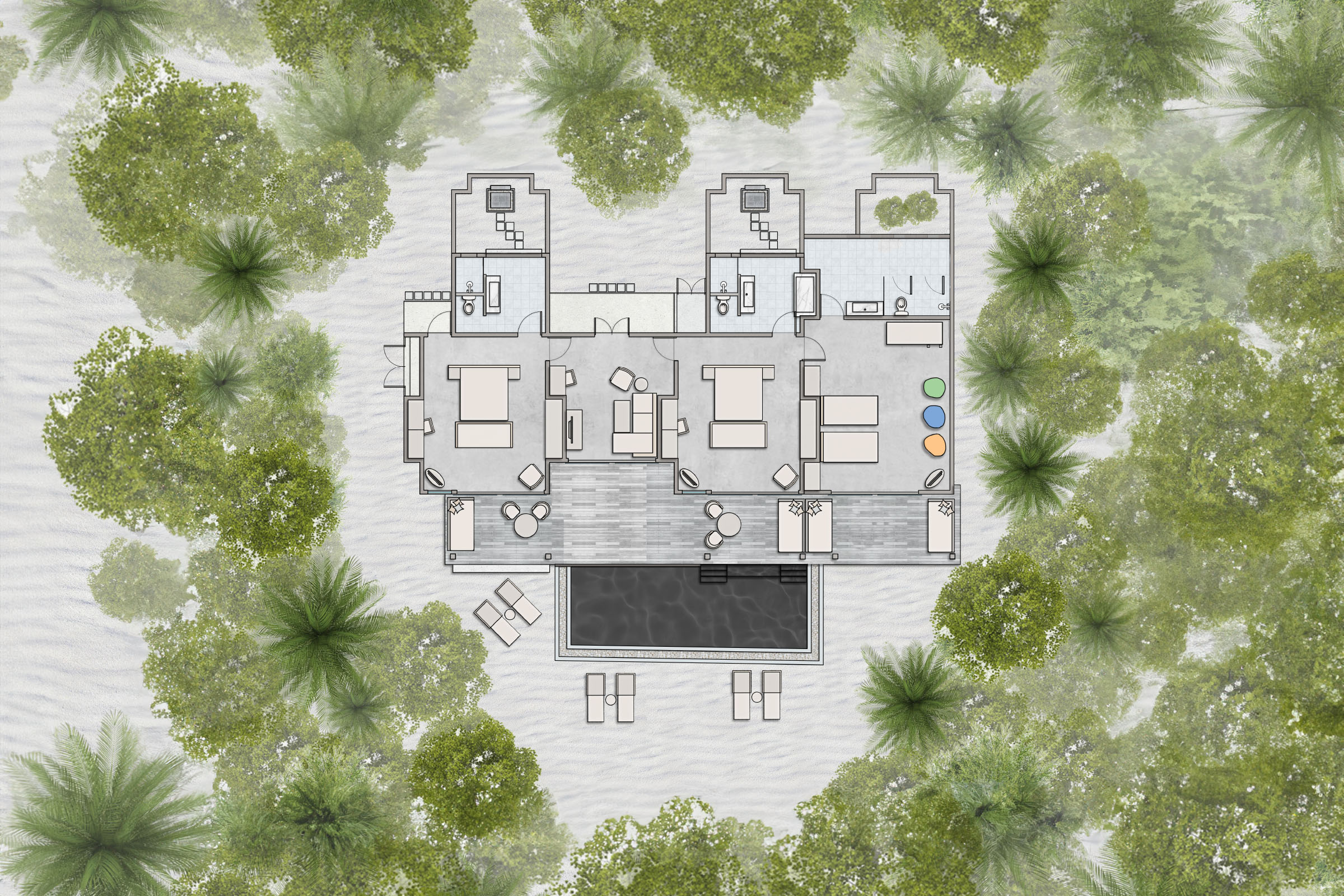 The Three Bedroom Pool Beach Villa is the ultimate escape for families and friends. With 346 sqm of luxury, it offers three master bedrooms, private pool, tropical bathrooms, and direct beach access. Enjoy spacious living areas, a private terrace, and a beachfront deck - perfect for relaxation and unforgettable moments.