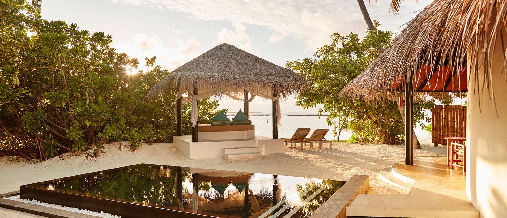 The private beachfront swimming pool, cabana daybed, and tropical bathroom gives you a true taste of life in the Maldives.