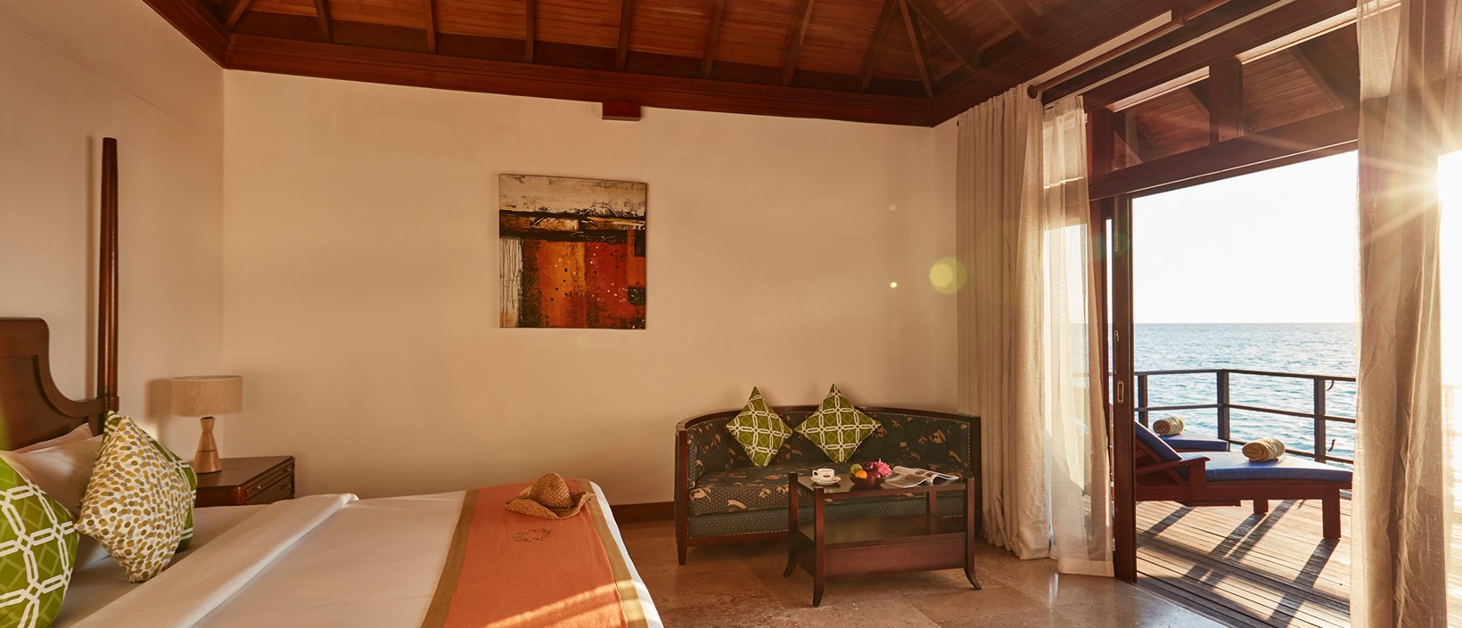 Roomier than our standard Water Villa, the Deluxe is decked out in true Maldivian style. The master bedroom with its living corner has some of the best views. The gorgeous bathroom has a standalone bathtub that overlooks the Indian Ocean. There’s also a sundeck with a stairway leading to the lagoon.
