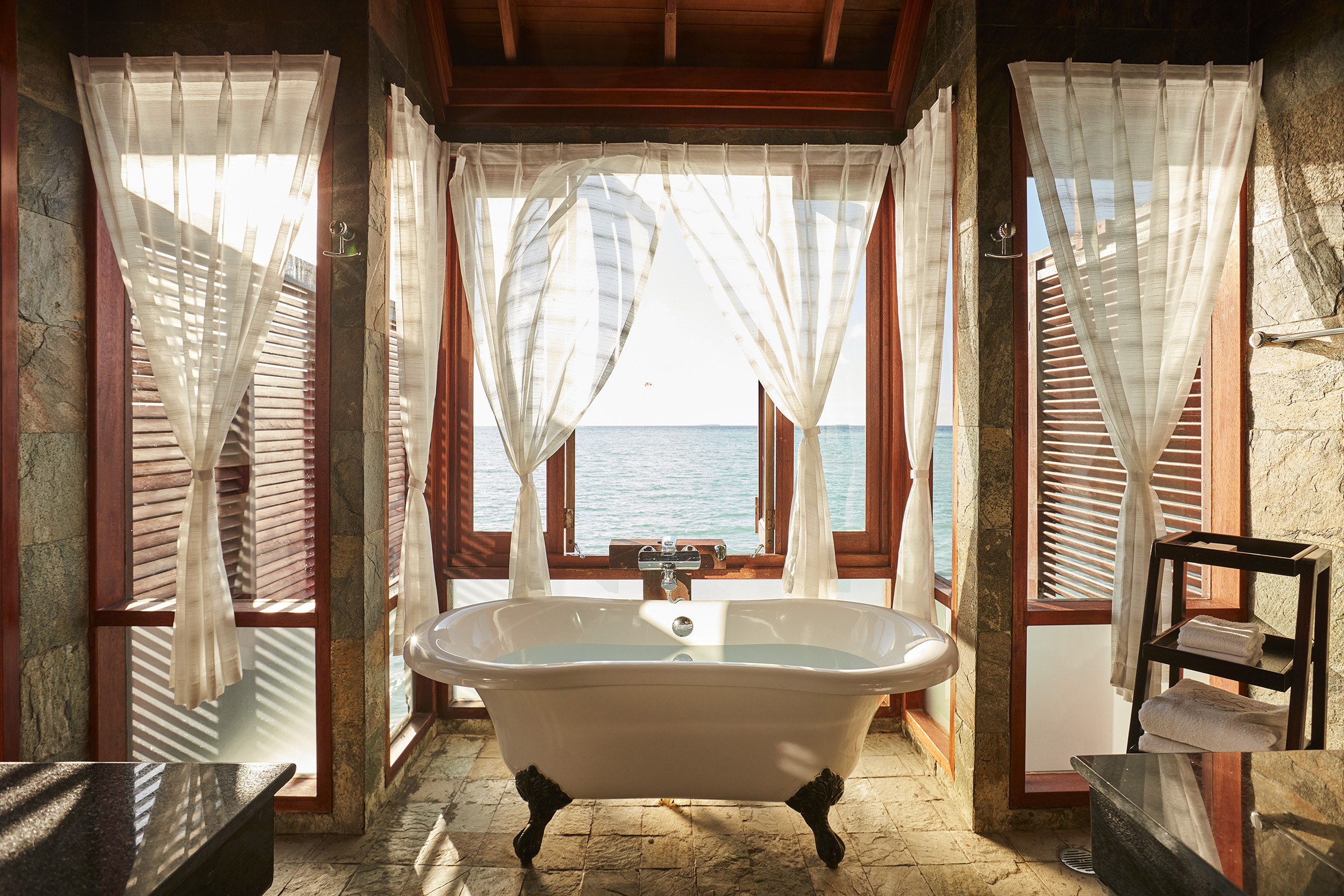 Roomier than our standard Water Villa, the Deluxe is decked out in true Maldivian style. The master bedroom with its living corner has some of the best views. The gorgeous bathroom has a standalone bathtub that overlooks the Indian Ocean. There’s also a sundeck with a stairway leading to the lagoon.