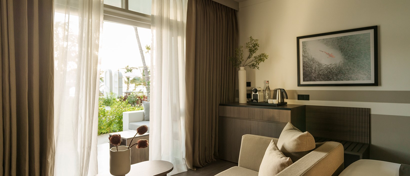 Its location on the western side of the island means one thing only: the best sunsets. The two-storey pavilions' rooms are cleverly designed to be interconnected if need be. The taupe, black, and grey palette lends tranquility to the interiors. Terrace or balcony, daybed, couch… It’s all there. A few steps away is the Maldives' longest swimming pool at 210 meters, which runs parallel to the beach.