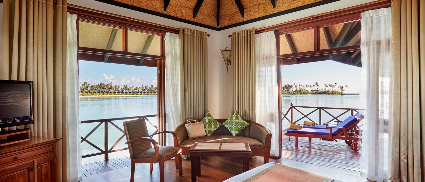 With its shingled roof and dark wood furnishings, this villa exudes a traditional charm. The wooden sundeck is the perfect spot to soak up the sun and take in the views of the various islands that make up the Olhuveli compound. Our standard overwater level is the perfect hideaway for two.