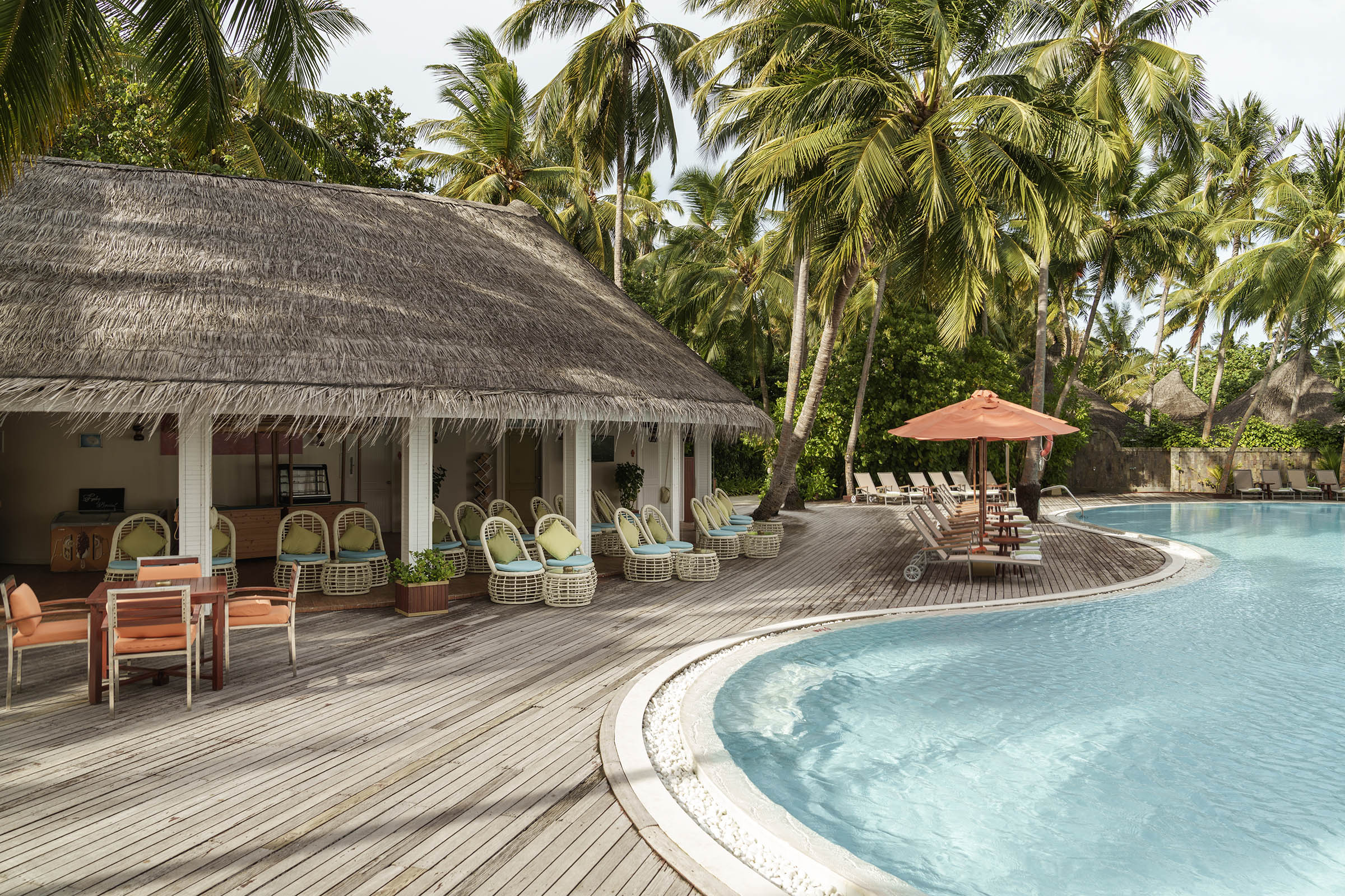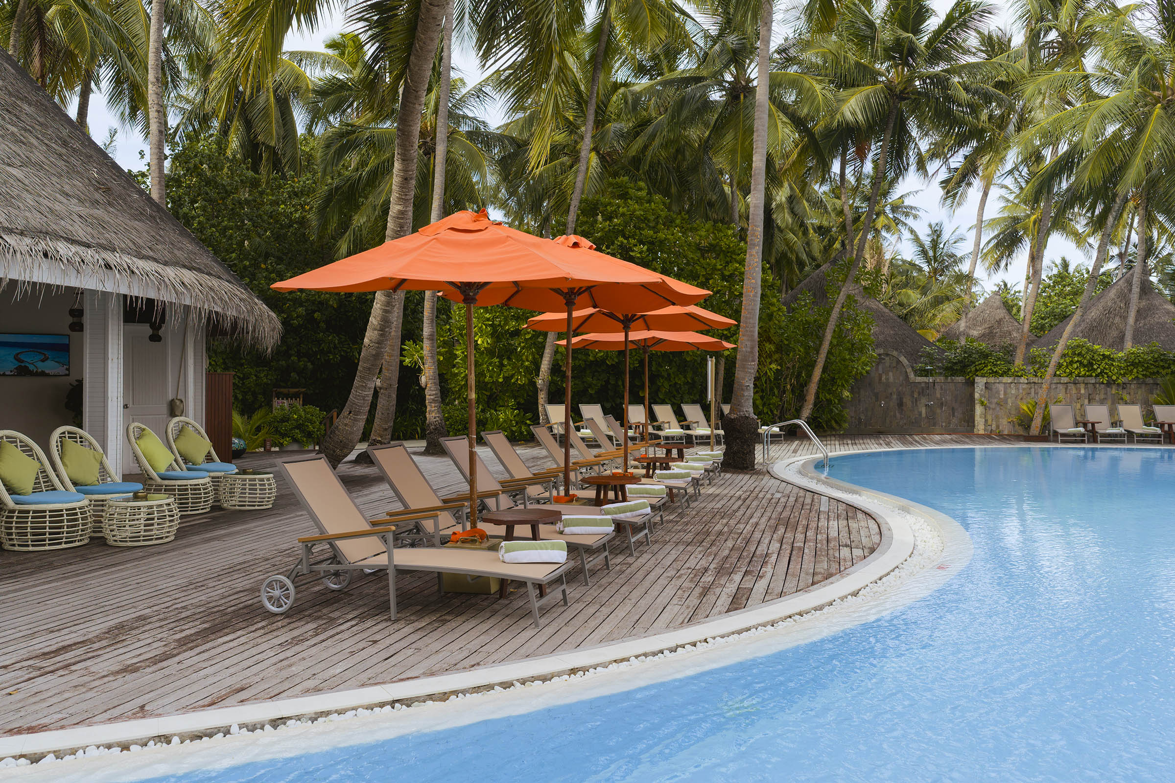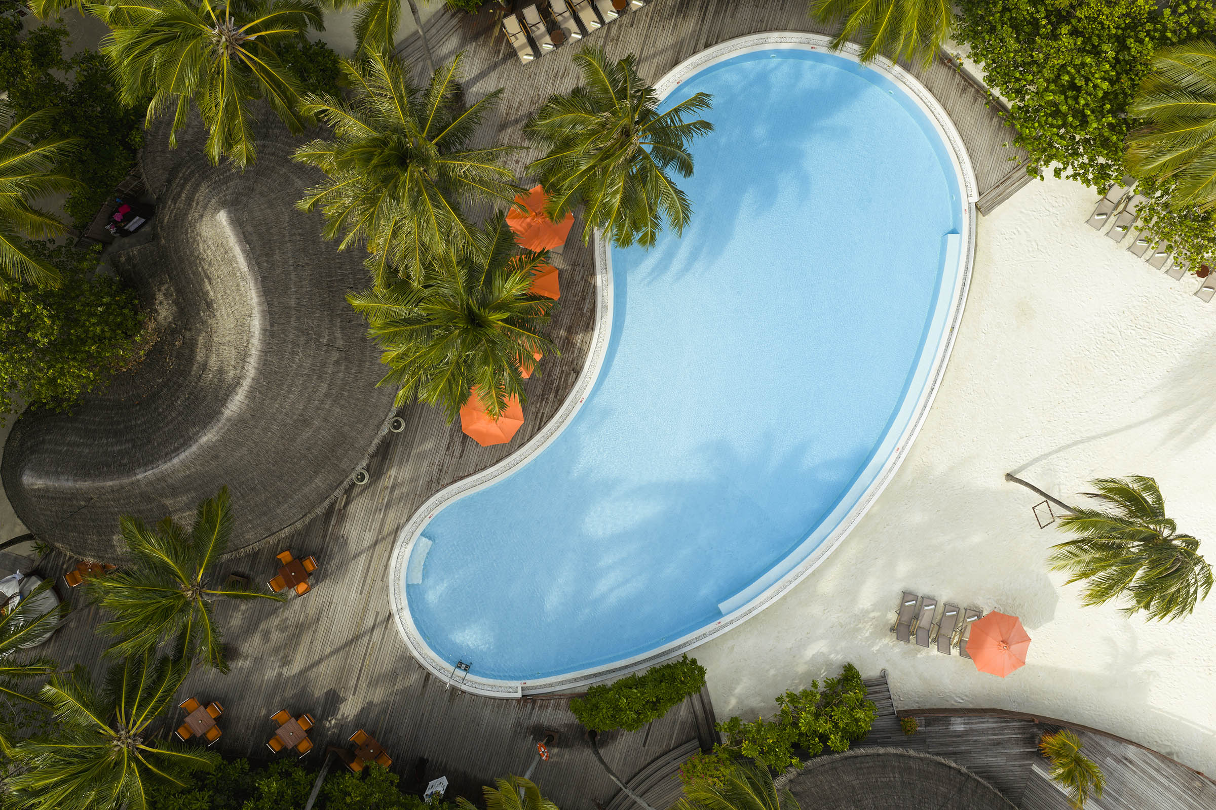 There’s a hint of retro in the air: the pale blue swimming pool recalls a Slim Aarons photograph, while the bright orange sunbeds add an element of playfulness. Take a seat, recline and let the bartender serve cocktails poolside in true island fashion. The drinks menu includes nourishing shakes to boost your immune system and other refreshing treats.